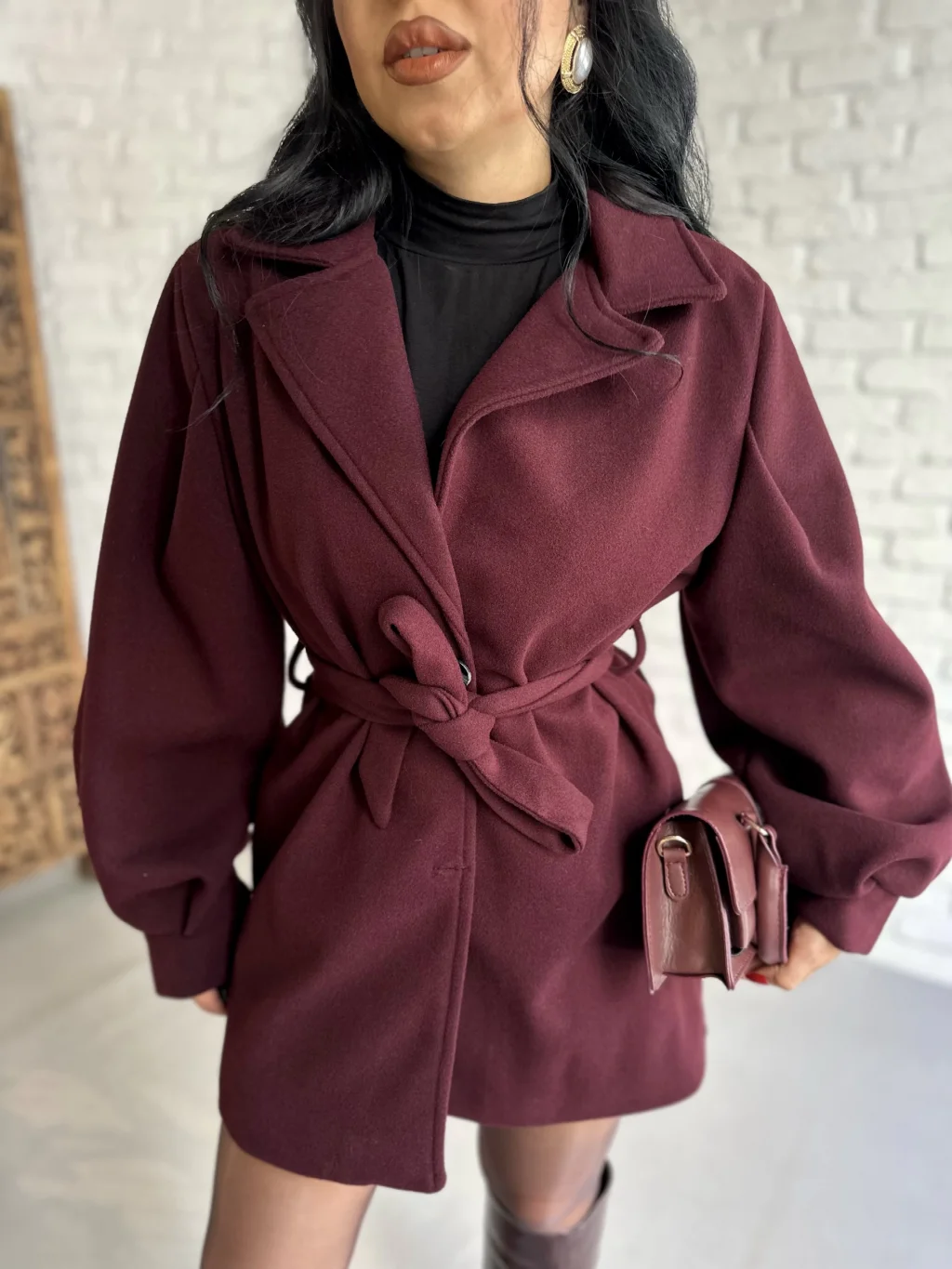 Kadın Kuşaklı Oversize Kısa Kaşe Kaban
