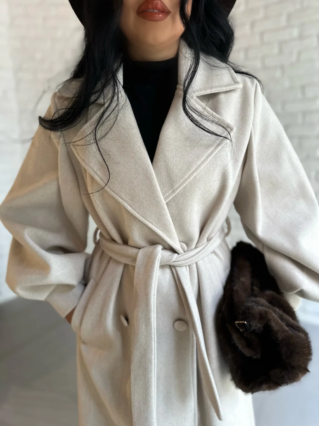 Kadın Balon Kol Kuşaklı Kaşe Kaban