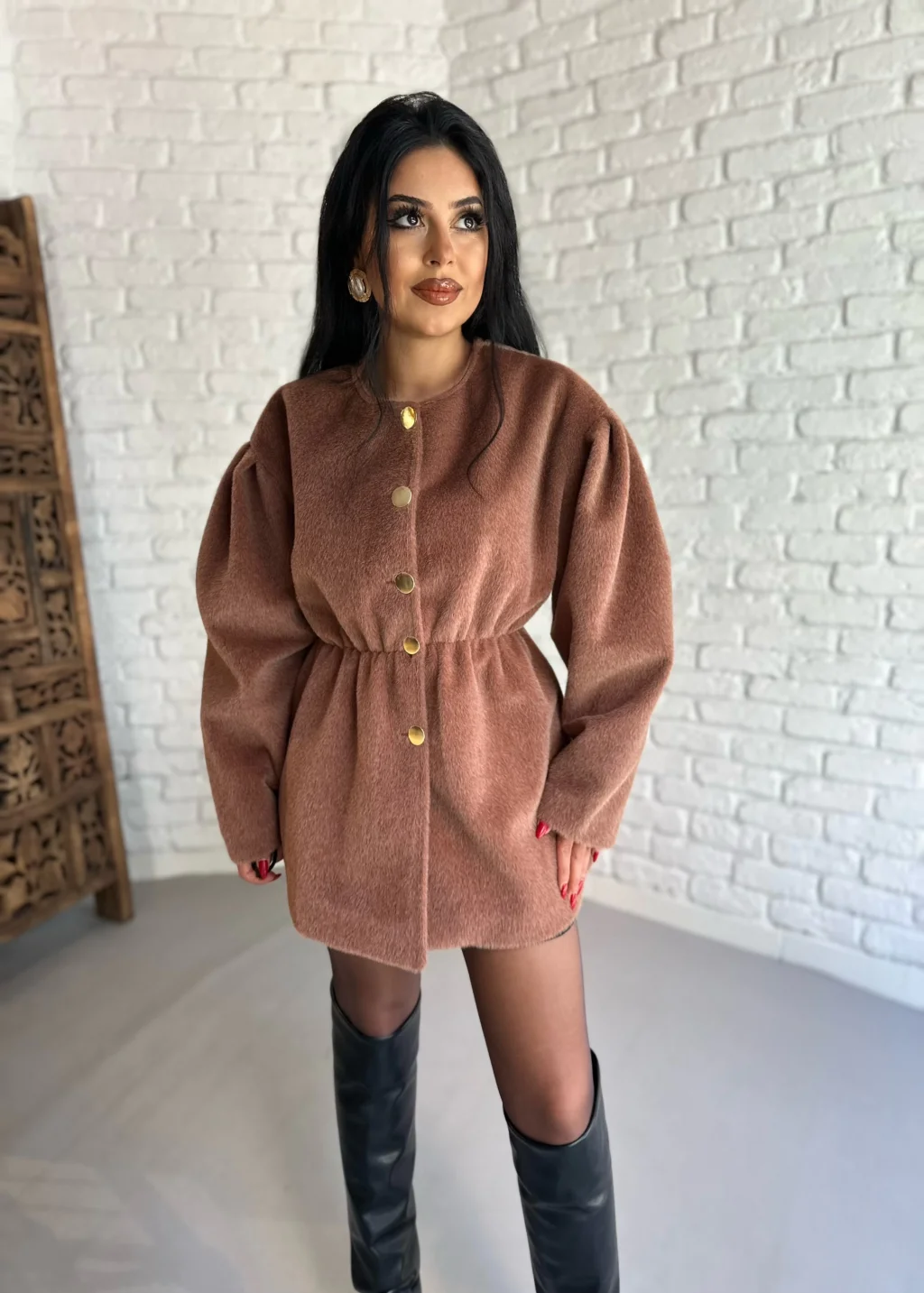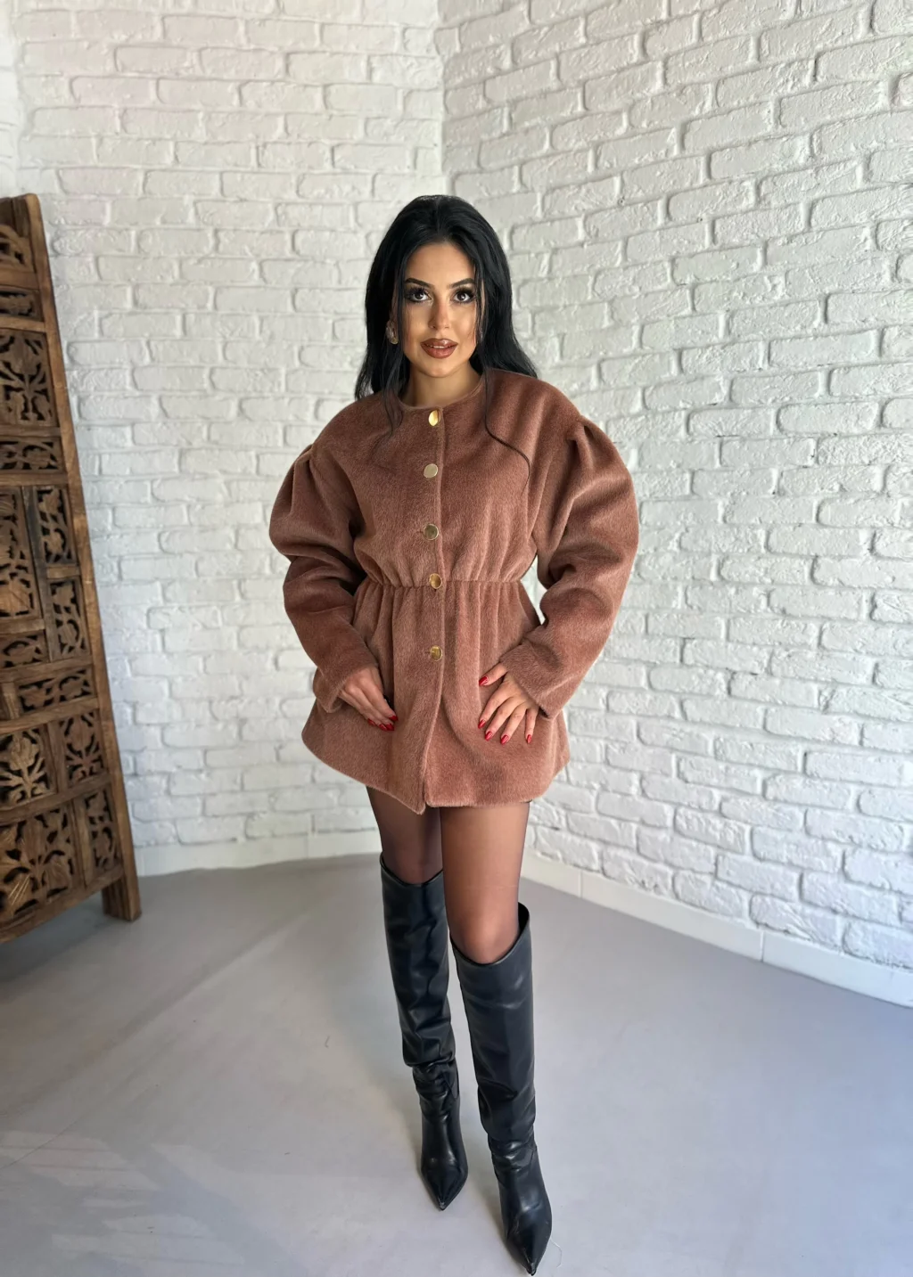 Kadın Önü Düğmeli Astarlı Kısa Kaşe Kaban