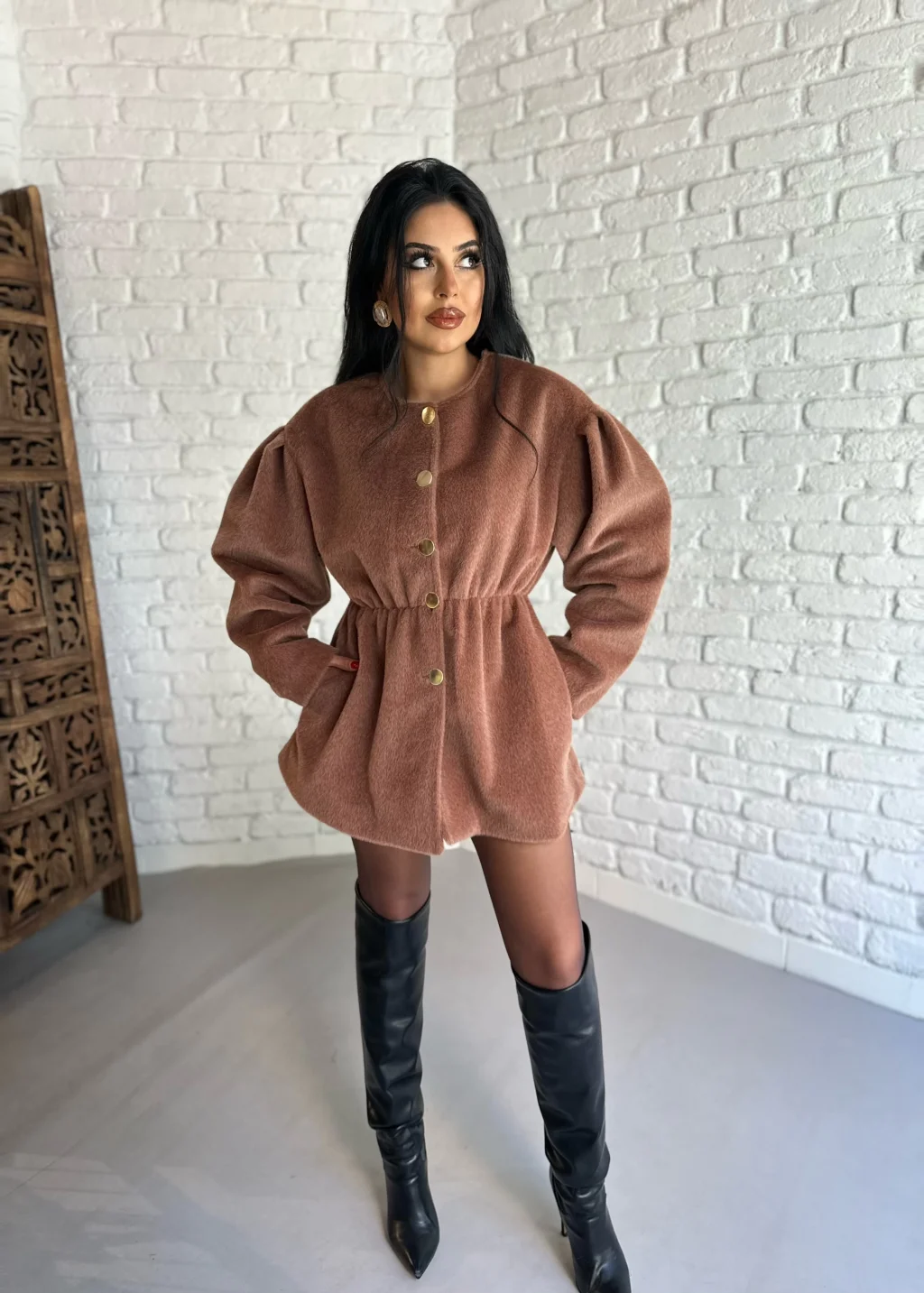 Kadın Balon Kol Kuşaklı Kaşe Kaban