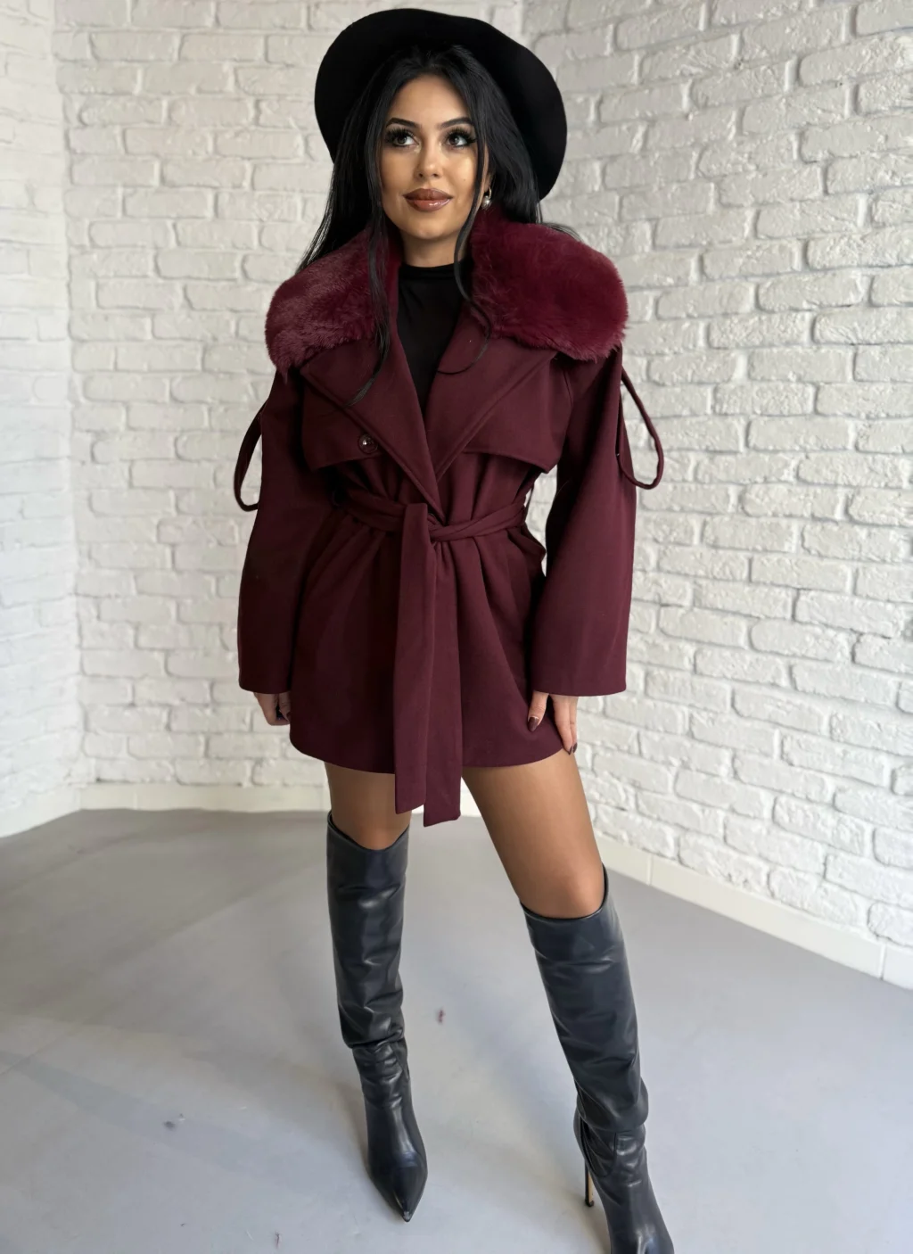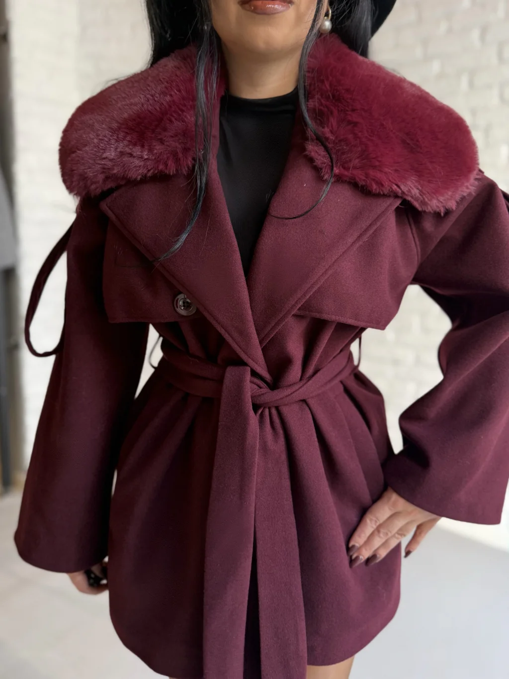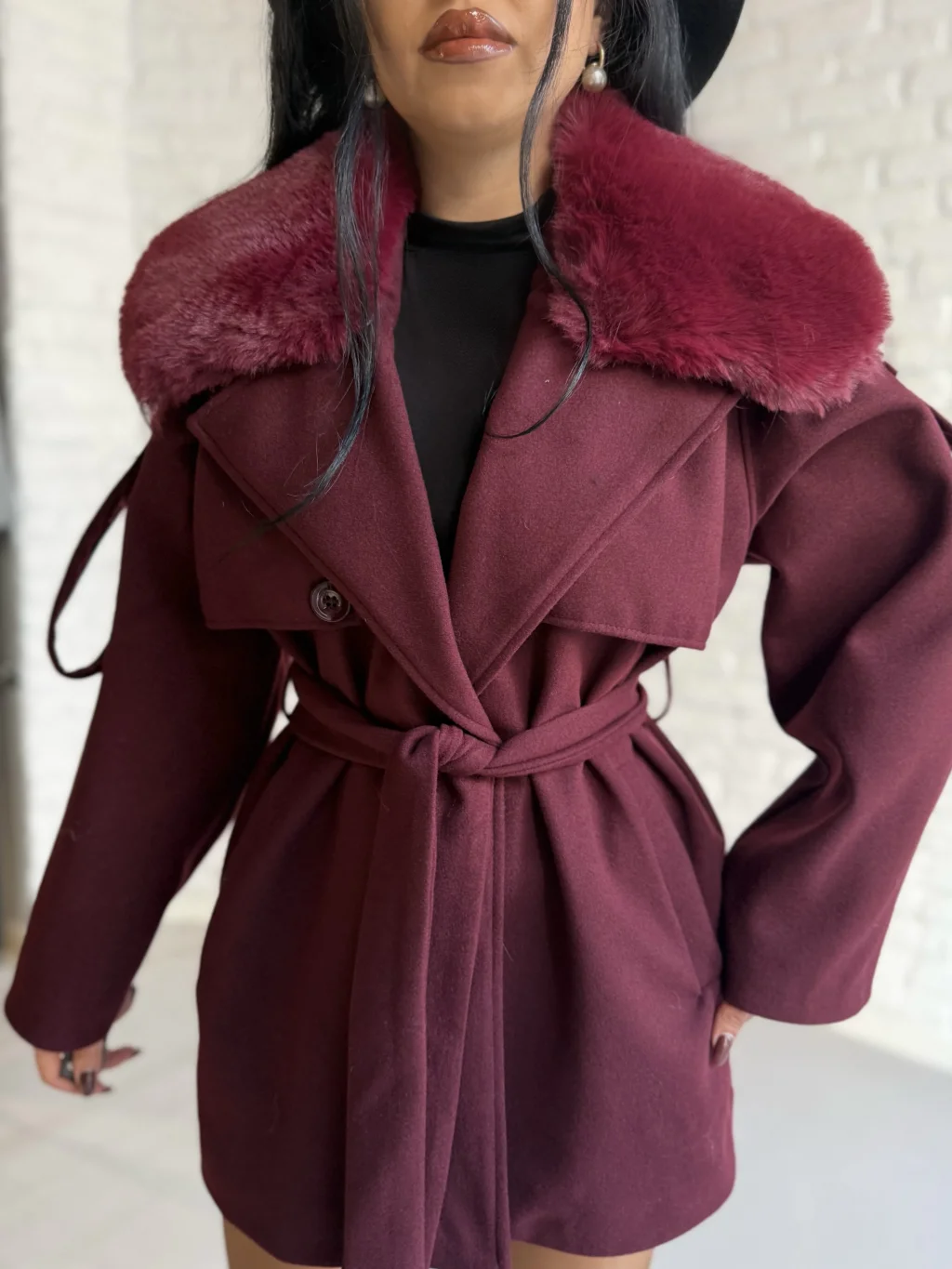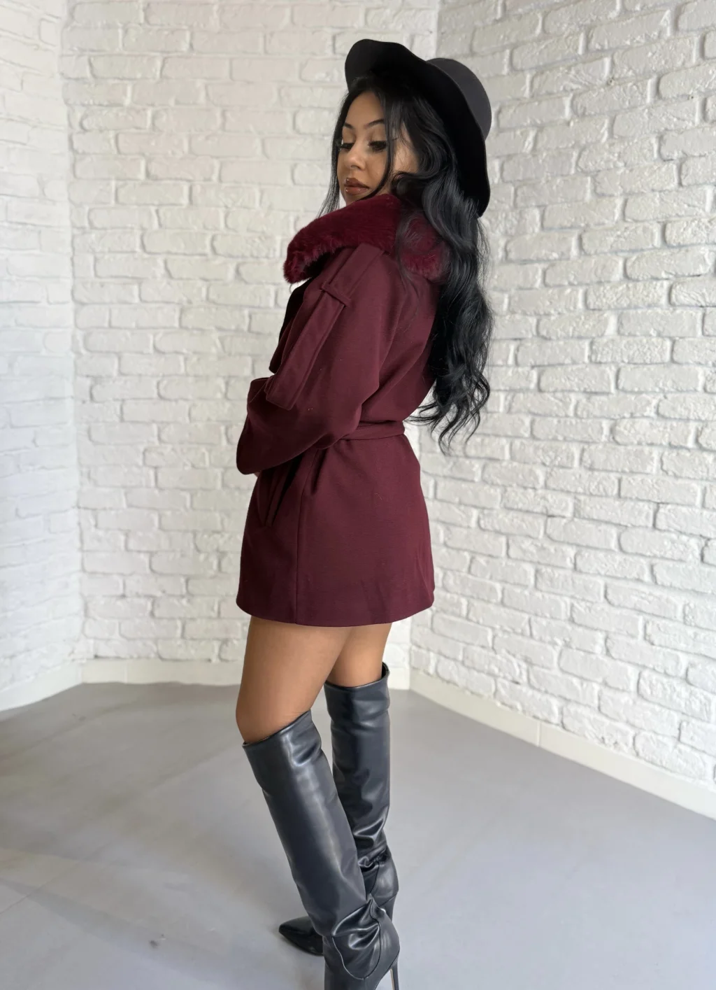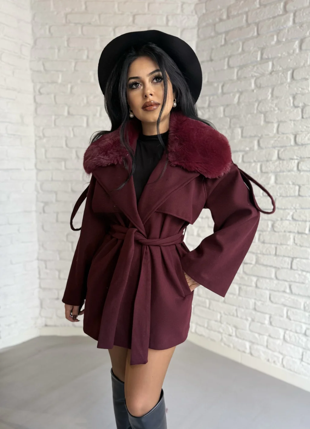 Kadın Çıkarılabilir Kürk Yaka Kaşe Kaban