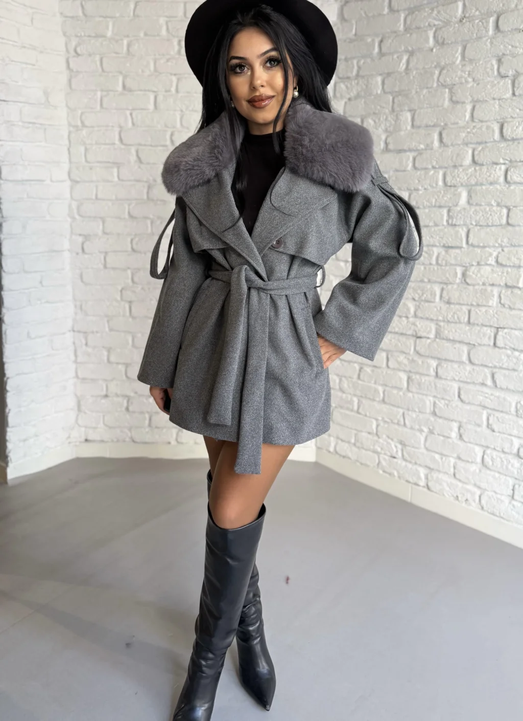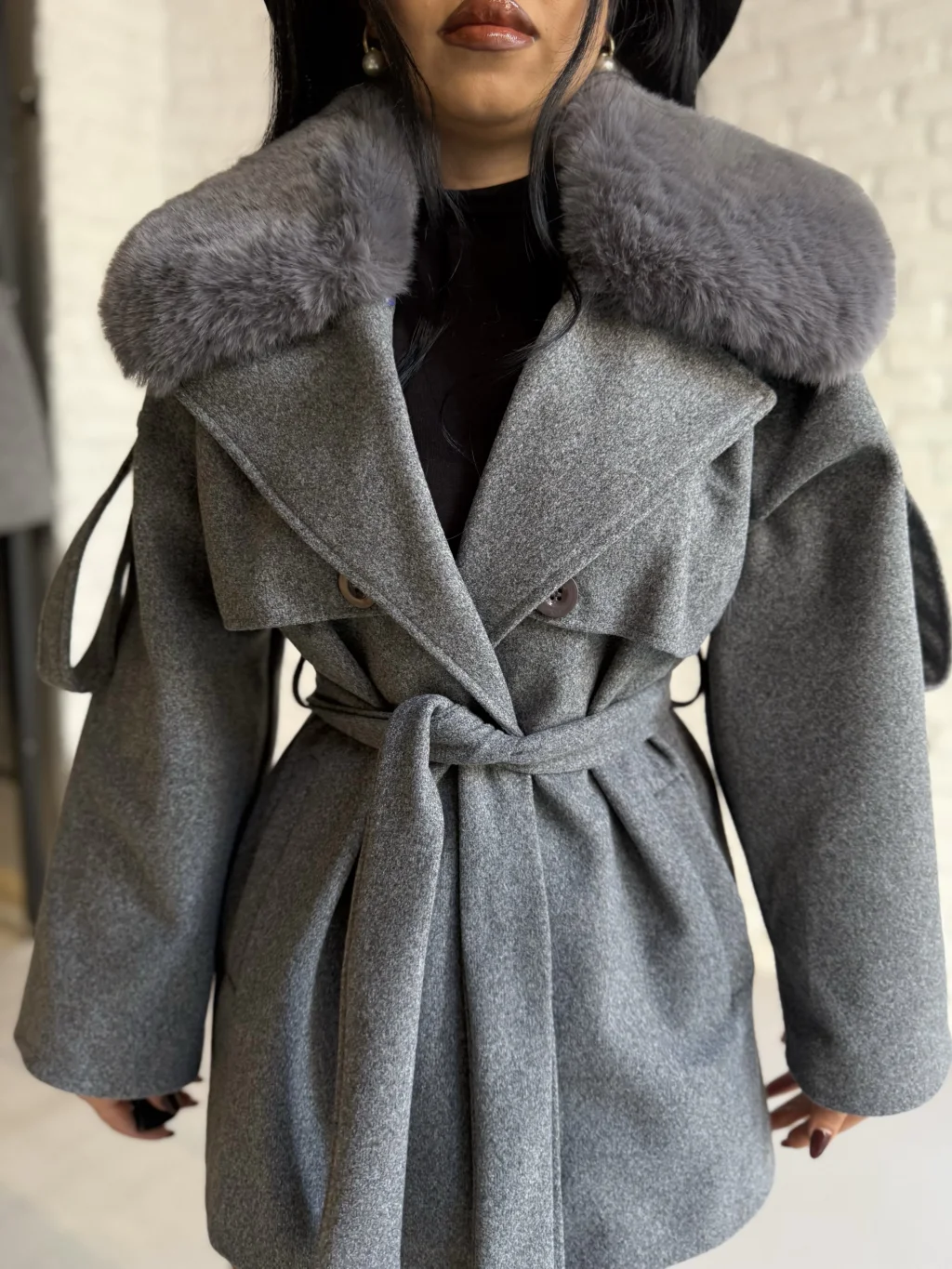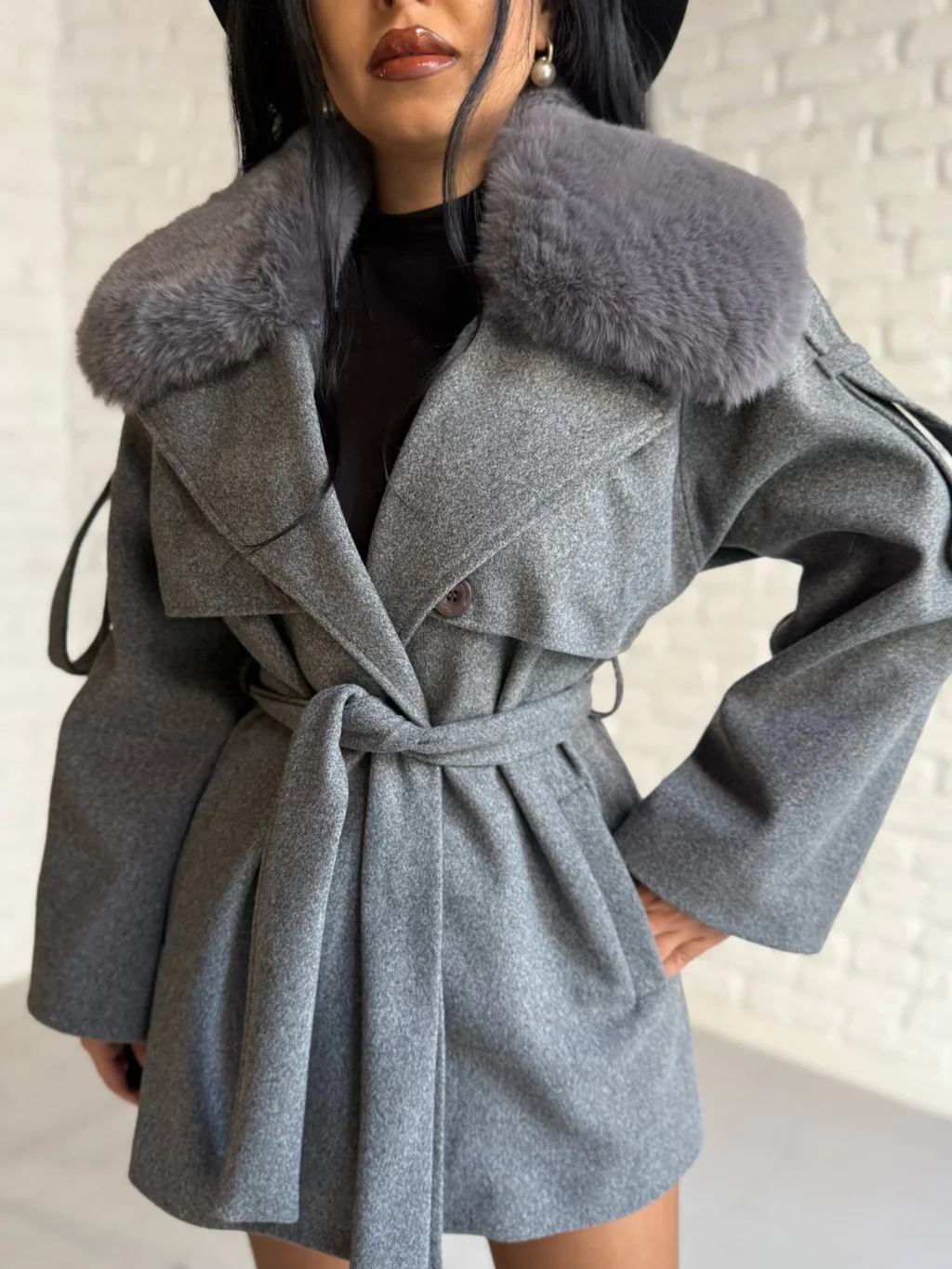 Kadın Çıkarılabilir Kürk Yaka Kaşe Kaban