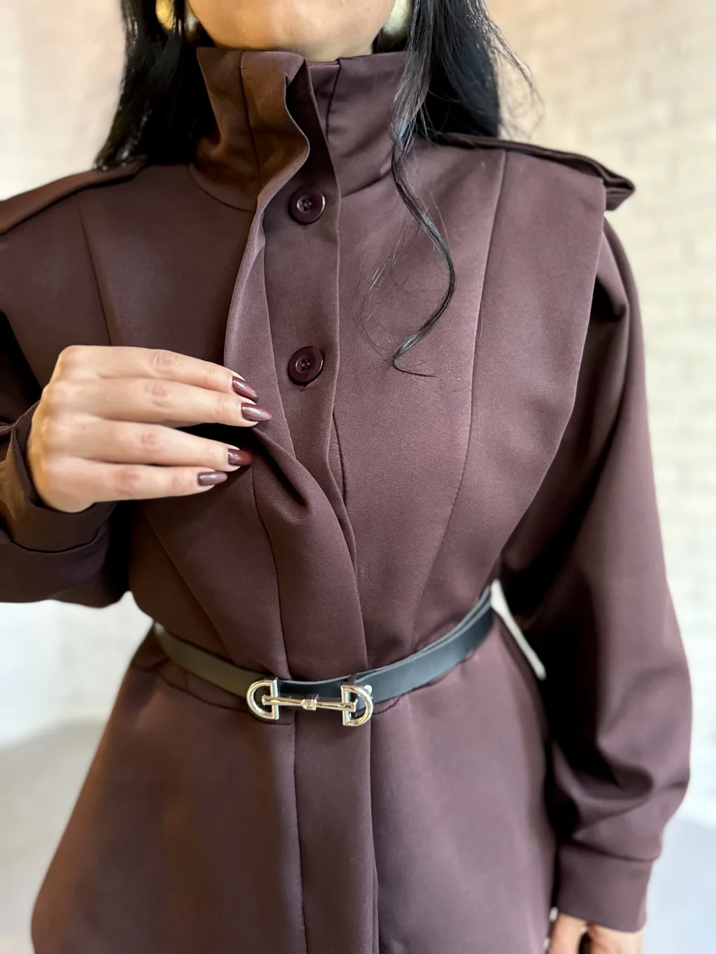 Kadın Dik Yaka Vatkalı Siyah Kemerli Ceket
