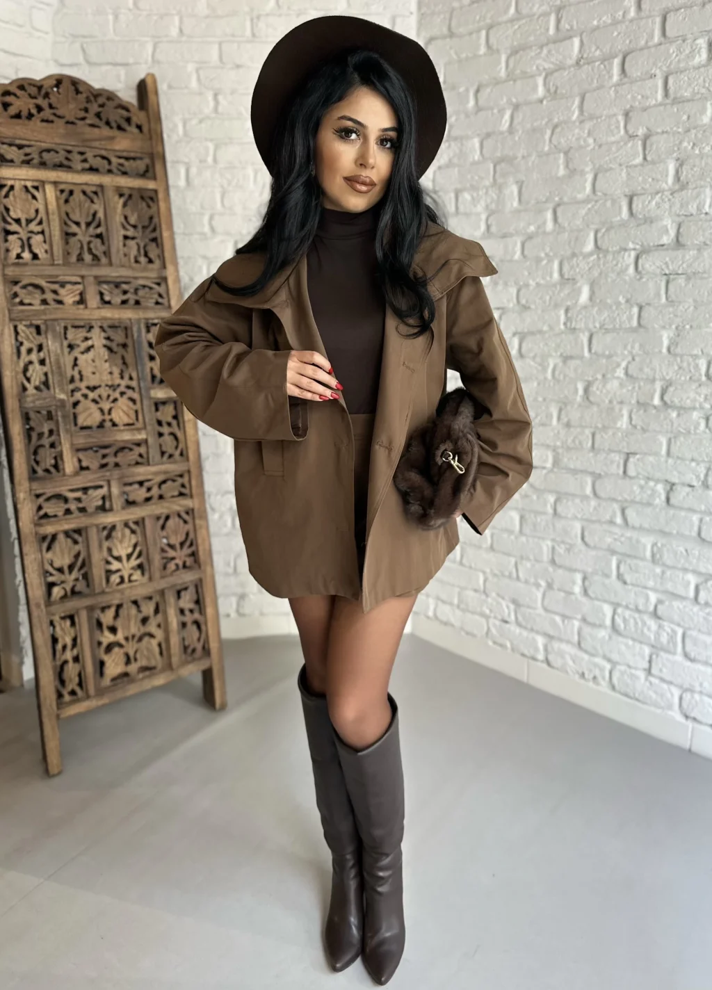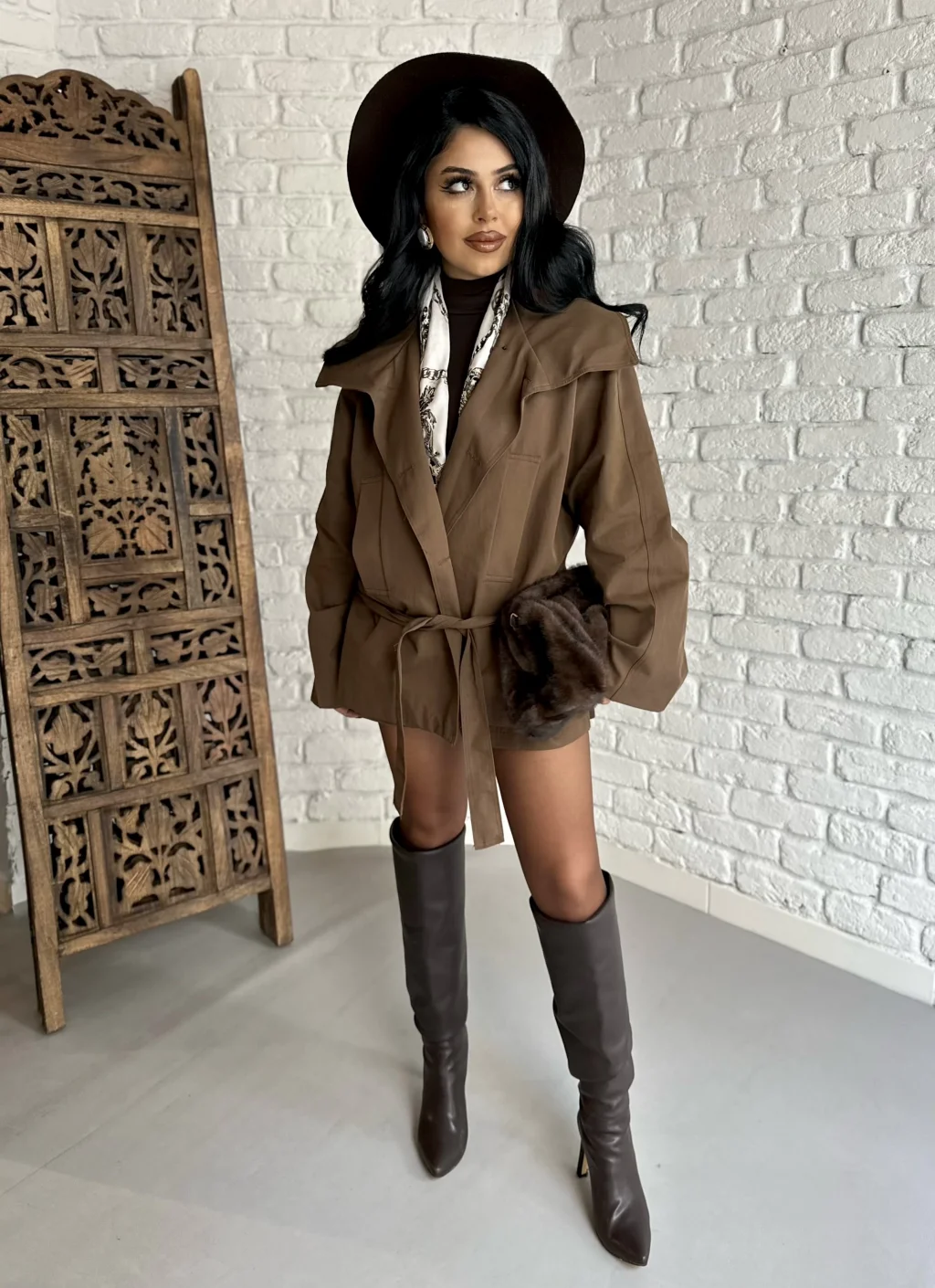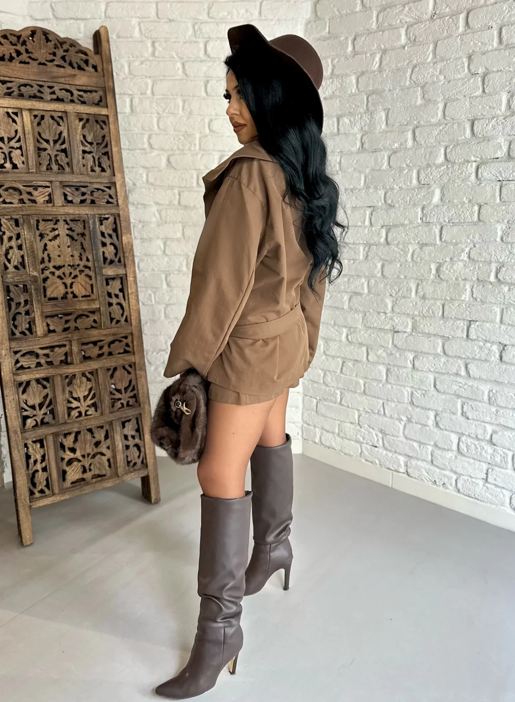 Kadın Kuşaklı Oversize Kısa Kaşe Kaban